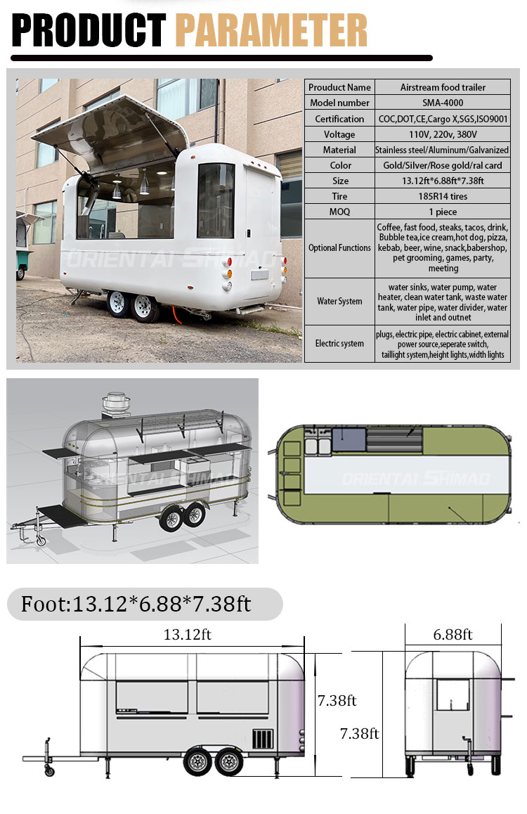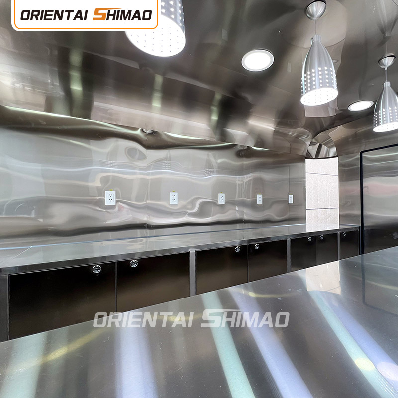 Kultainen ruostumaton teräs: ruokaauton ulkopinta on valmistettu korkealaatuisesta kultaisesta ruostumattomasta teräksestä. Tällä materiaalilla ei ole vain erinomainen korroosion- ja kulutuskestävyys, vaan myös kultainen ulkonäkö lisää visuaalista kauneutta ja korkealaatuista tunnetta, jotta ruoka-auto voi erottua erilaisissa ympäristöissä.