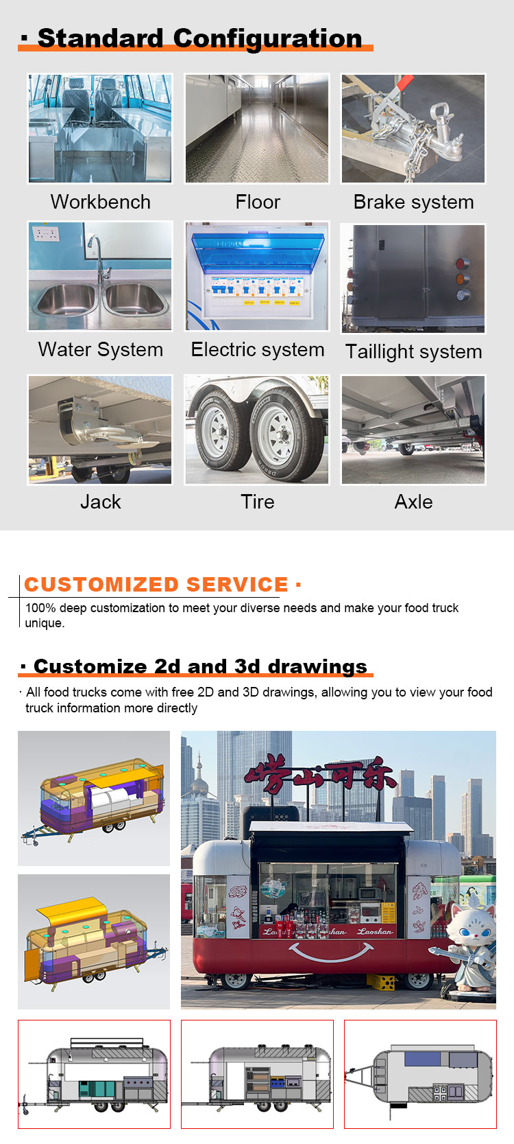 Päämateriaaliksi valitsimme korkealaatuisen ruostumattoman 304-teräksen, joka tunnetaan erinomaisesta korroosionkestävyydestään ja erinomaisesta kestävyydestään ja joka pystyy ylläpitämään vakaata suorituskykyä erilaisissa ympäristöolosuhteissa varmistaen, että Food Catering Trailers -tuotteemme voivat säilyttää erinomaisen laatunsa ja toimivuutensa myös pitkällä aikavälillä ja kohtaavat monenlaisia haasteita. 304 ruostumattoman teräksen erinomainen korroosionkestävyys, joten kuorma-autoon ei ole helppo vaikuttaa hapettumisen tai ruosteen vaikutuksiin, mikä pidentää huomattavasti sen käyttöikää. Ruostumattoman 304-teräksen erinomainen korroosionkestävyys tekee kuorma-autosta vähemmän alttiita hapettumiselle tai ruosteelle, mikä pidentää huomattavasti niiden käyttöikää.