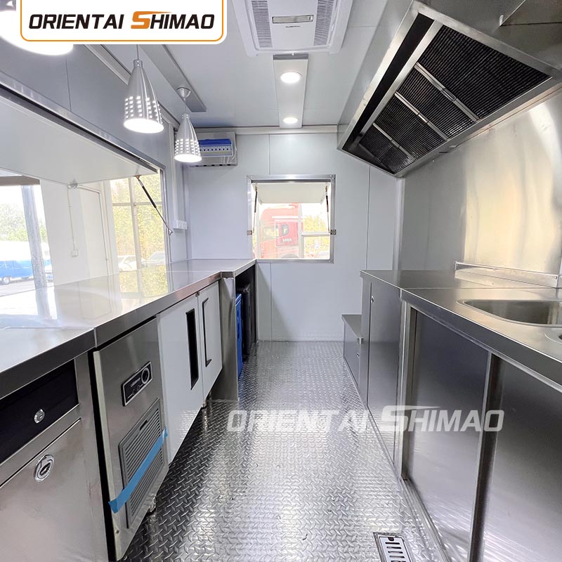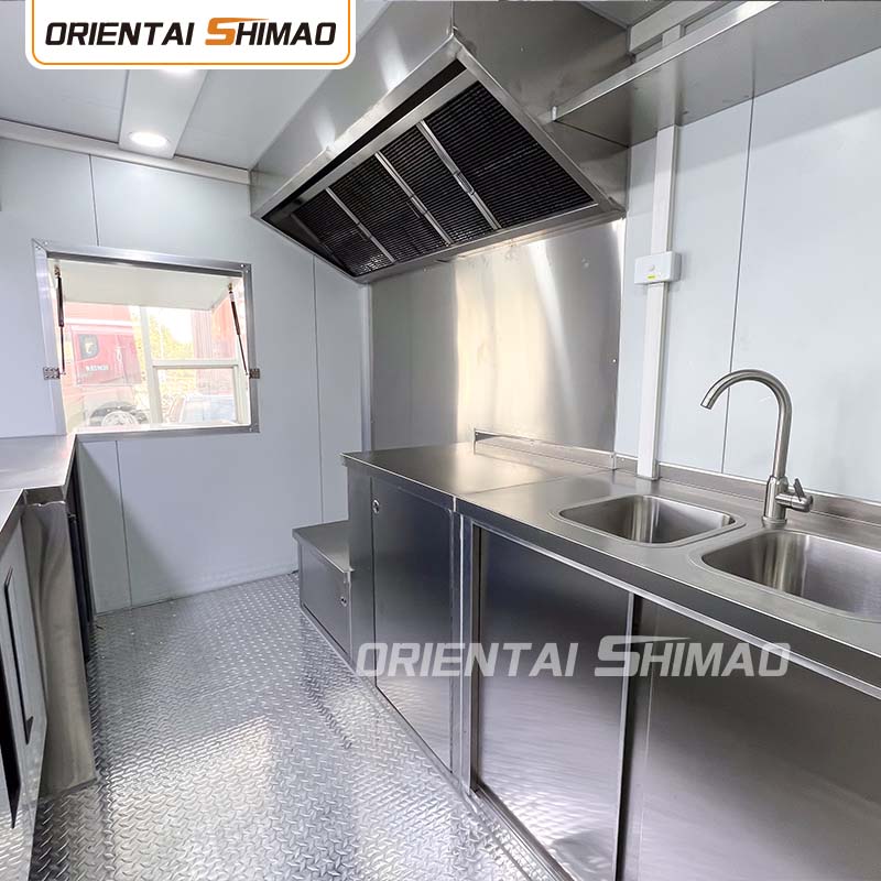 Ruostumattomasta teräksestä valmistettu sisäpuoli: Sisustus on valmistettu ruostumattomasta teräksestä, mikä varmistaa vahvan ja kestävän sisustuksen, joka on helppo puhdistaa ja huoltaa ja täyttää elintarvikehygieniastandardit. Ruostumattoman teräksen käyttö ei vain paranna ruoka-auton käyttöikää, vaan myös varmistaa ruoanvalmistusprosessin hygienian ja turvallisuuden.
