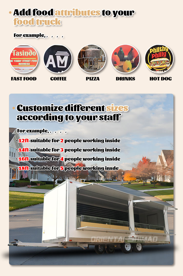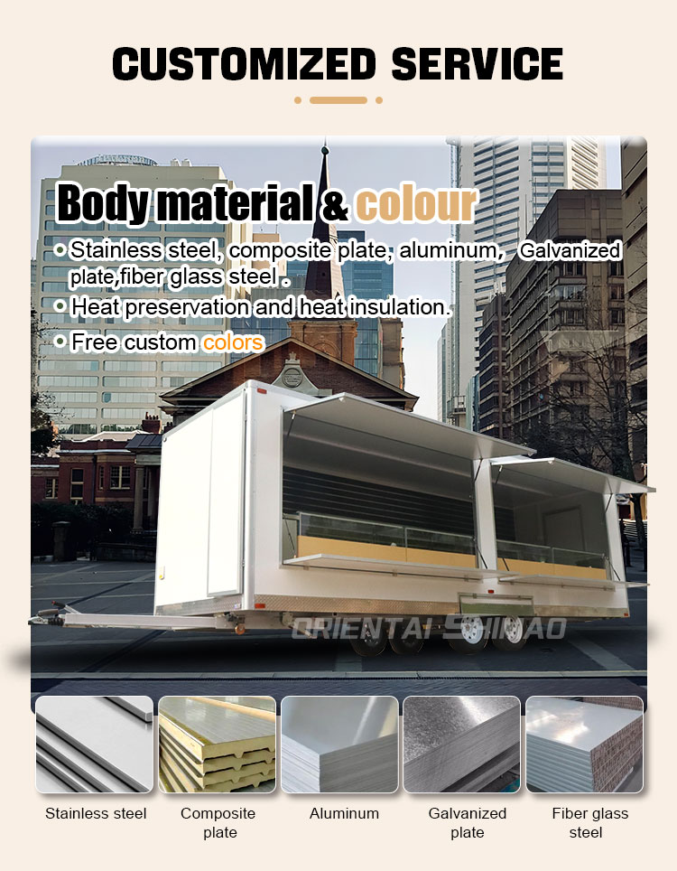 Kokojen mukauttaminen: Perinteisten rajojen lisäksi rikkomme tavanomaisten ruoka -autojen kokokehyksen ja tarjoamme sinulle rajoittamattomia mahdollisuuksia koon mukauttamisratkaisuihin. Etsitkö pieniä ja hienoja ja hienoja, helppo matkustaa kaupungin kujien läpi, tai ylellinen mobiiliravintola, joka haluaa saada tilavan tilan, joka mahtuu enemmän asiakkaita ja laitteita, voimme mitata ja suunnitella tarkasti erityistarpeidesi mukaan, jotta voidaan luoda ruoka -autokoko, joka vastaa todellisia tarpeita ja on täynnä luovuutta.