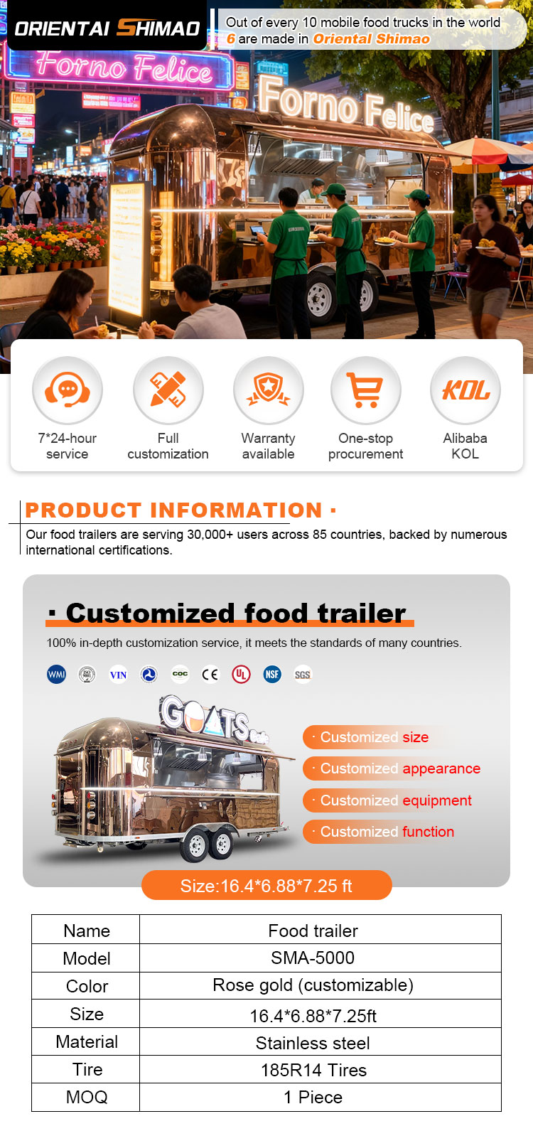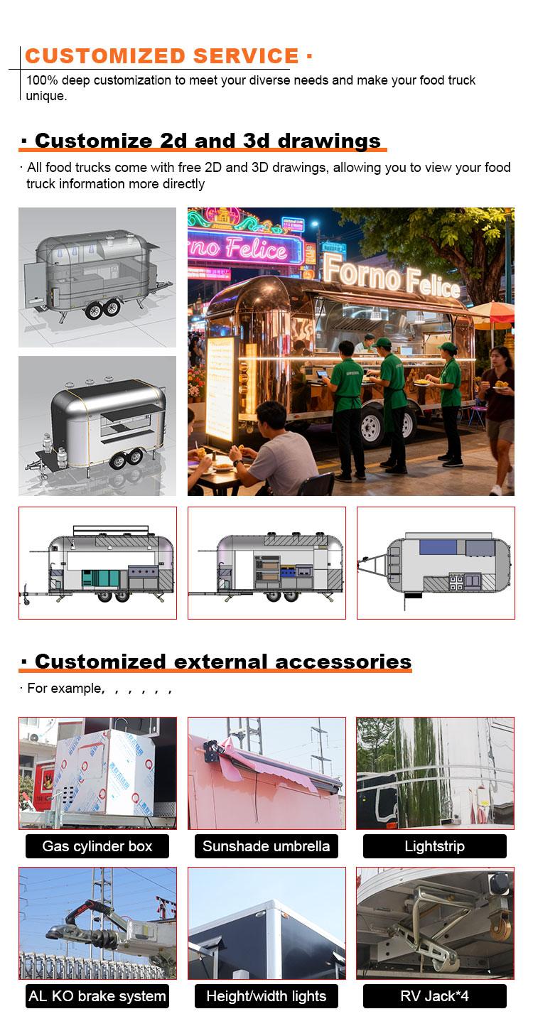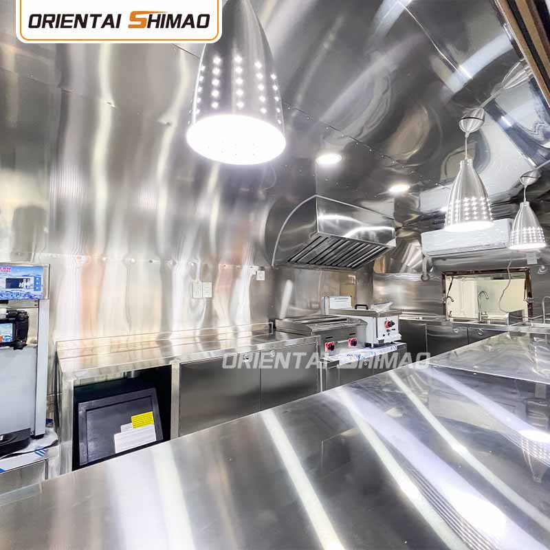 Päämateriaaliksi valitsimme korkealaatuisen ruostumattoman 304-teräksen, joka tunnetaan erinomaisesta korroosionkestävyydestään ja erinomaisesta kestävyydestään ja joka pystyy ylläpitämään vakaata suorituskykyä erilaisissa ympäristöolosuhteissa varmistaen, että Food Catering Trailers -tuotteemme voivat säilyttää erinomaisen laatunsa ja toimivuutensa myös pitkällä aikavälillä ja kohtaavat monenlaisia haasteita. 304 ruostumattoman teräksen erinomainen korroosionkestävyys, joten kuorma-autoon ei ole helppo vaikuttaa hapettumisen tai ruosteen vaikutuksiin, mikä pidentää huomattavasti sen käyttöikää. Ruostumattoman 304-teräksen erinomainen korroosionkestävyys tekee kuorma-autosta vähemmän alttiita hapettumiselle tai ruosteelle, mikä pidentää huomattavasti niiden käyttöikää.
