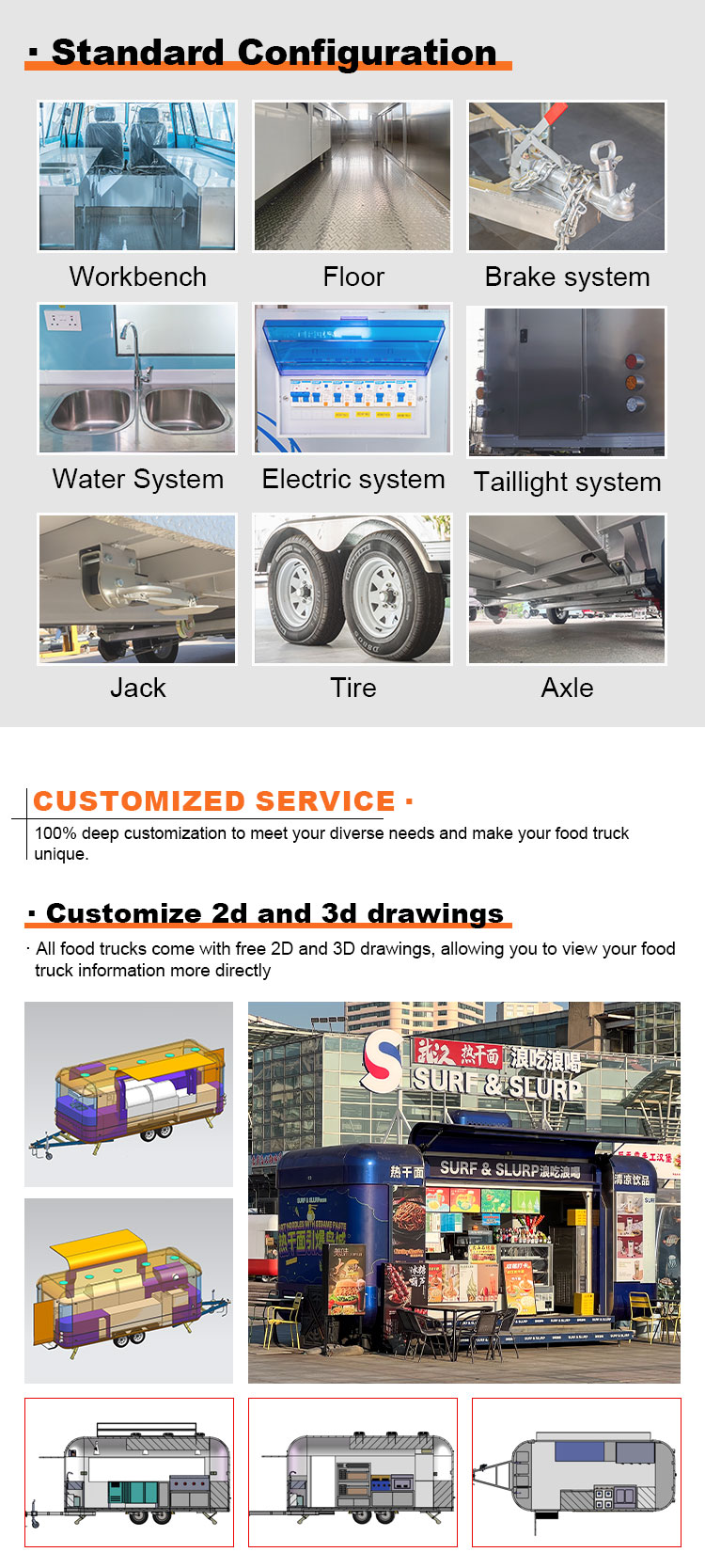 Päämateriaaliksi valitsimme korkealaatuisen ruostumattoman 304-teräksen, joka tunnetaan erinomaisesta korroosionkestävyydestään ja erinomaisesta kestävyydestään ja joka pystyy ylläpitämään vakaata suorituskykyä erilaisissa ympäristöolosuhteissa varmistaen, että Food Catering Trailers -tuotteemme voivat säilyttää erinomaisen laatunsa ja toimivuutensa myös pitkällä aikavälillä ja kohtaavat monenlaisia haasteita. 304 ruostumattoman teräksen erinomainen korroosionkestävyys, joten kuorma-autoon ei ole helppo vaikuttaa hapettumisen tai ruosteen vaikutuksiin, mikä pidentää huomattavasti sen käyttöikää. Ruostumattoman 304-teräksen erinomainen korroosionkestävyys tekee kuorma-autosta vähemmän alttiita hapettumiselle tai ruosteelle, mikä pidentää huomattavasti niiden käyttöikää.