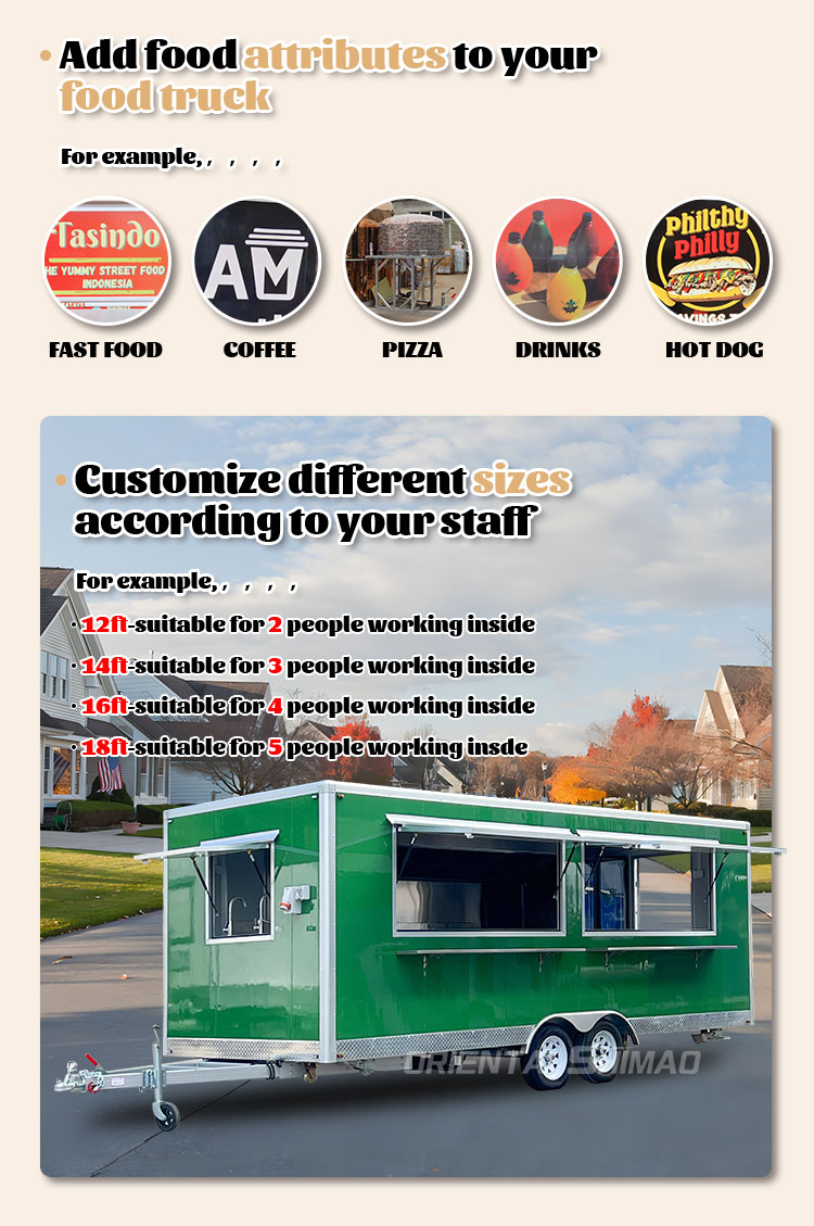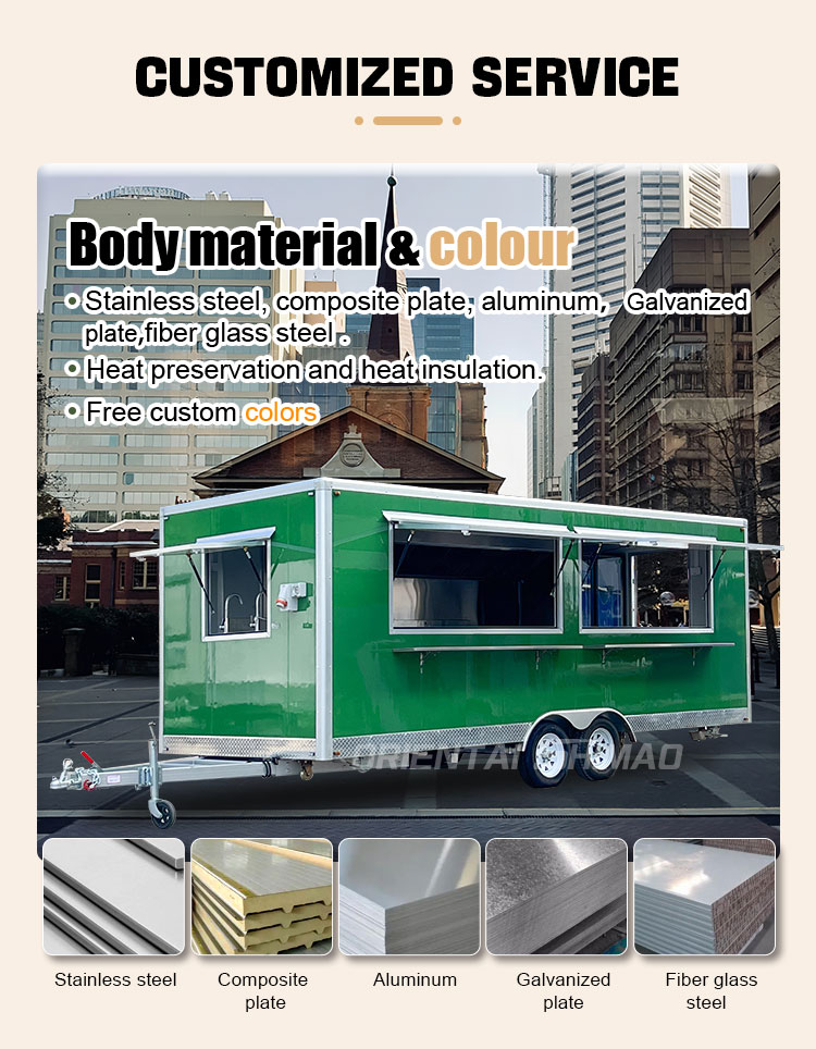 Mallinnus ja tyyli: Food truckin ulkonäön mallinnus ja tyyli on tärkeä tekijä asiakkaiden houkuttelemisessa. Se voidaan räätälöidä asiakkaiden tuotekuvan, liiketoiminnan ominaisuuksien tai henkilökohtaisten mieltymysten mukaan, kuten virtaviivainen muotoilu, retrotyyli, moderni yksinkertaisuus ja niin edelleen.