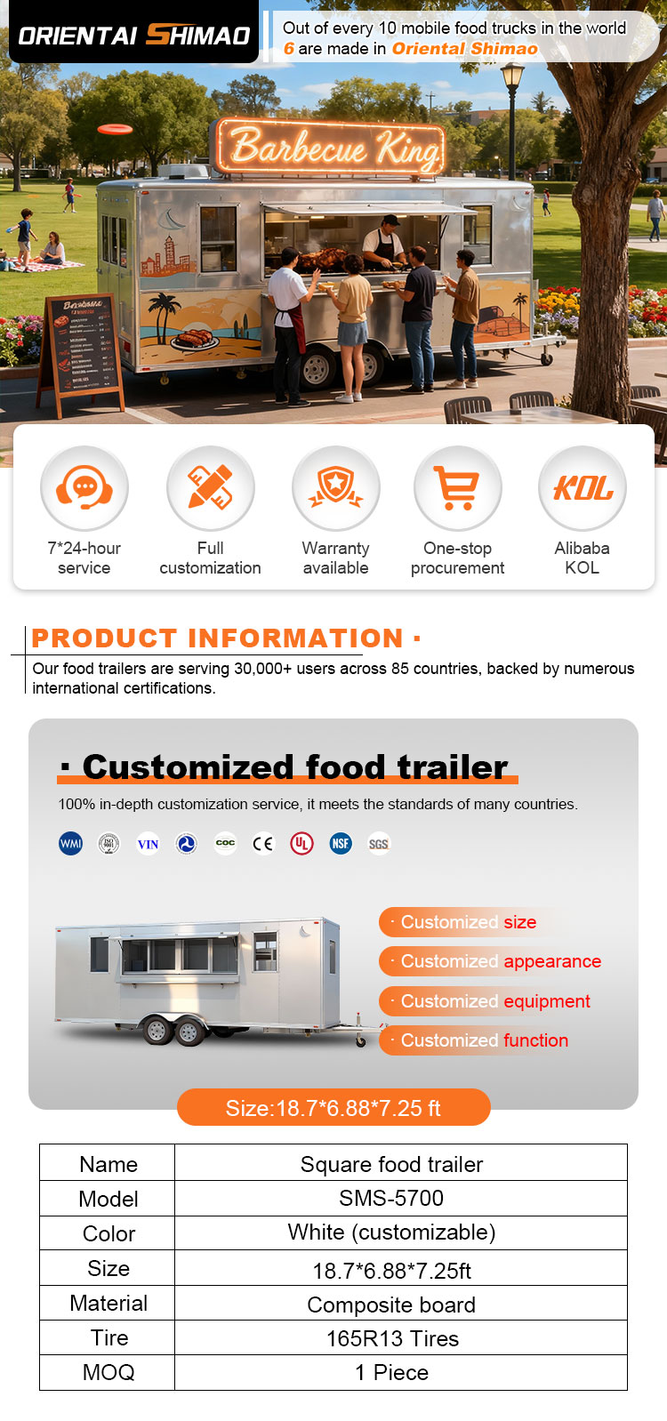 Voimme tarjota Mobile Food Truck -perävaunun sertifikaatteja: DOT, CE, SGS, SCI, ISO, COC,