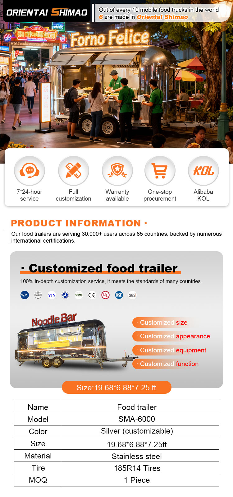 Voimme tarjota Food Catering -perävaunujen sertifikaatteja: DOT, CE, SGS, SCI, ISO, COC,