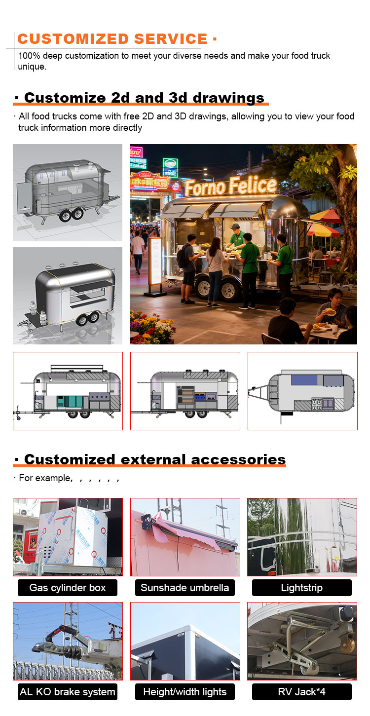 Päämateriaaliksi valitsimme korkealaatuisen ruostumattoman 304-teräksen, joka tunnetaan erinomaisesta korroosionkestävyydestään ja erinomaisesta kestävyydestään ja joka pystyy ylläpitämään vakaata suorituskykyä erilaisissa ympäristöolosuhteissa varmistaen, että Food Catering Trailers -tuotteemme voivat säilyttää erinomaisen laatunsa ja toimivuutensa myös pitkällä aikavälillä ja kohtaavat monenlaisia haasteita. 304 ruostumattoman teräksen erinomainen korroosionkestävyys, joten kuorma-autoon ei ole helppo vaikuttaa hapettumisen tai ruosteen vaikutuksiin, mikä pidentää huomattavasti sen käyttöikää. Ruostumattoman 304-teräksen erinomainen korroosionkestävyys tekee kuorma-autosta vähemmän alttiita hapettumiselle tai ruosteelle, mikä pidentää huomattavasti niiden käyttöikää.