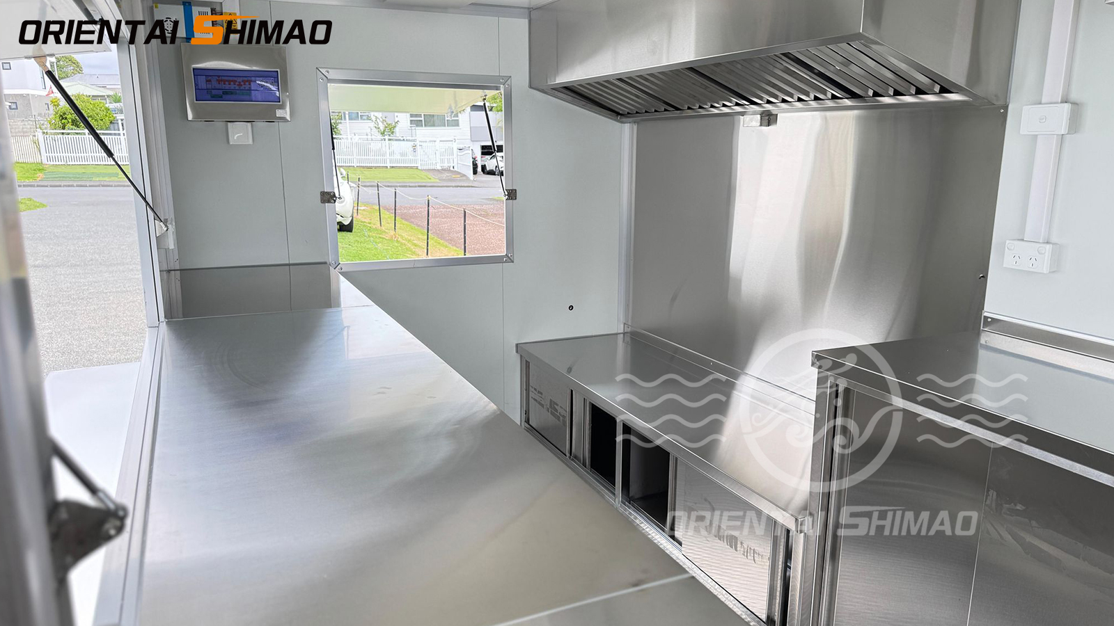 Tämä elintarvikealus on varustettu kattavilla vesi- ja sähköjärjestelmillä, ja tarjoaa vertaansa vailla olevan käyttökokemuksen. Sekä työtila että kaapit on muotoiltu vankasta 304 ruostumattomasta teräksestä, mikä varmistaa kestävyyden ja puhdistuksen helppouden vastustaen ruostetta. Lisäksi työpöydän alle asennetaan jääkaappi ruoan pilaantumisen estämiseksi.