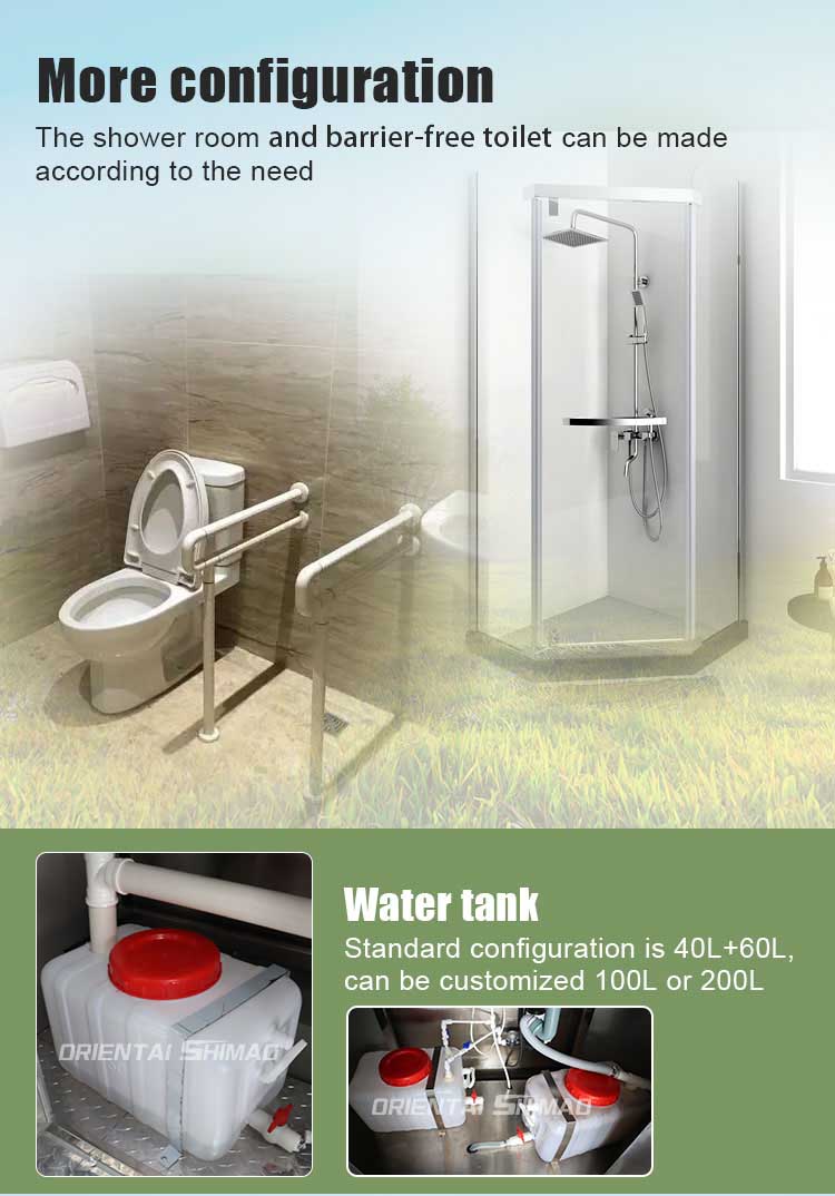 Erinomainen ympäristösuorituskyky: liikkuva terveysvaunu ottaa käyttöön edistyneimmän ympäristönsuojelutekniikan, integroimalla veden säästävää huuhtelujärjestelmää ja erittäin tehokasta jätevedenkäsittelylaitetta, mikä vähentää tehokkaasti vedenkulutusta ja pilaantumisen purkamista, varmistaen ympäristönsuojelun ja hygienian käyttöprosessissa.