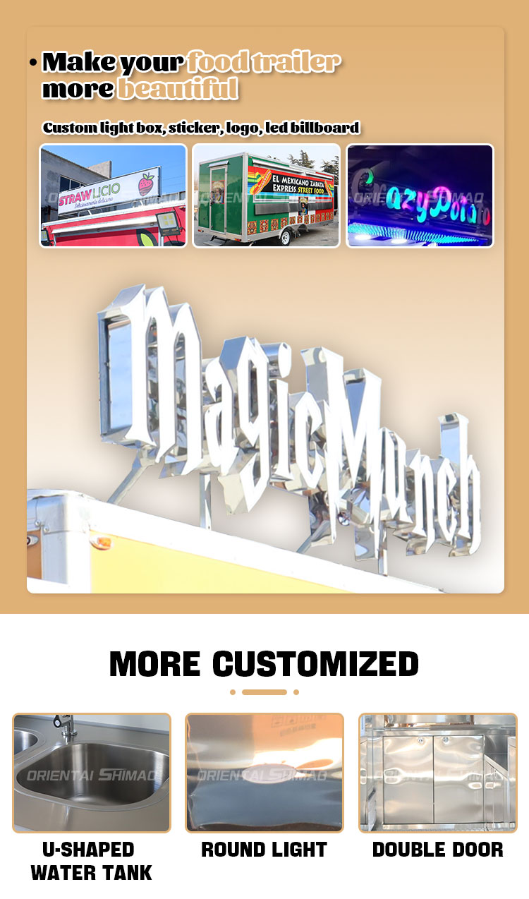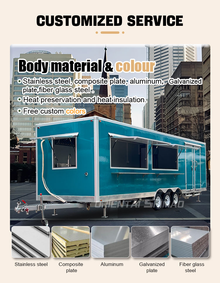 Mallinnus ja tyyli: Food truckin ulkonäön mallinnus ja tyyli on tärkeä tekijä asiakkaiden houkuttelemisessa. Se voidaan räätälöidä asiakkaiden tuotekuvan, liiketoiminnan ominaisuuksien tai henkilökohtaisten mieltymysten mukaan, kuten virtaviivainen muotoilu, retrotyyli, moderni yksinkertaisuus ja niin edelleen.